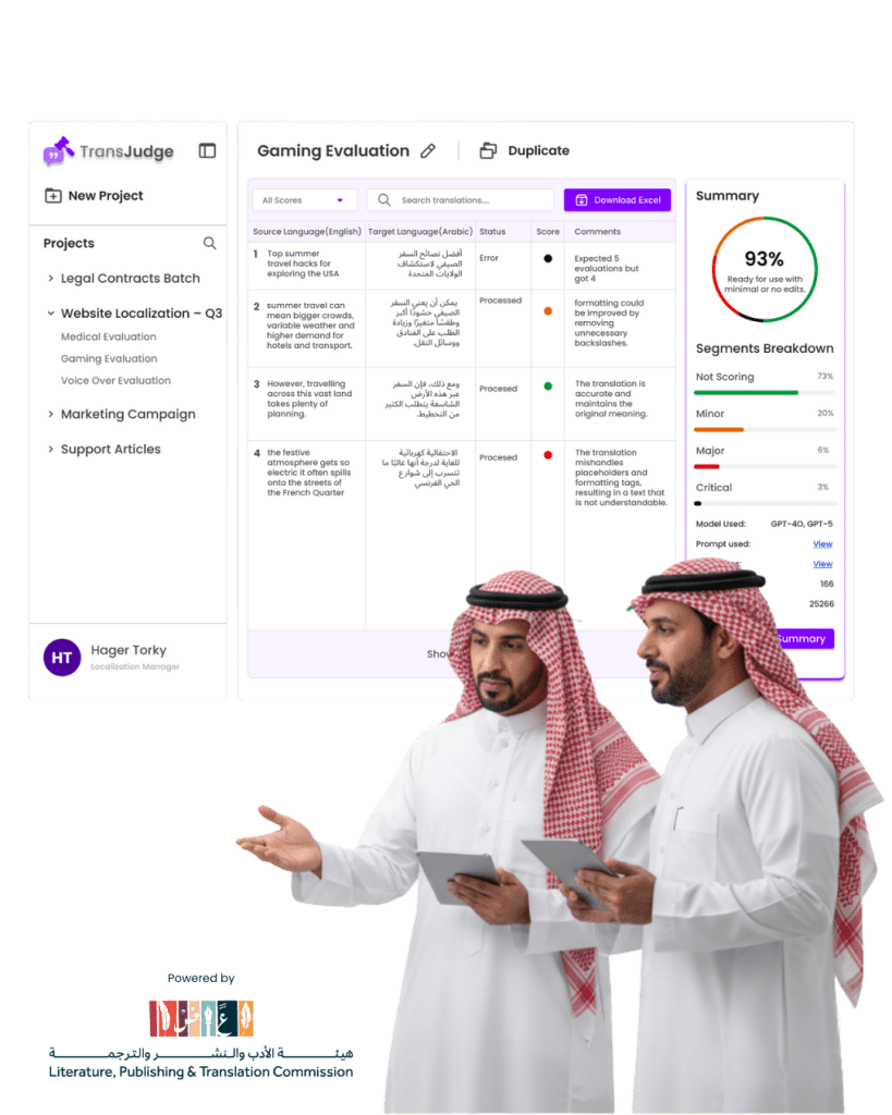 TransJudge is an advanced AI-powered platform developed by BayanTech under the patronage of  Saudi Arabia’s Ministry of Culture and the Literature, Publishing & Translation Commission.